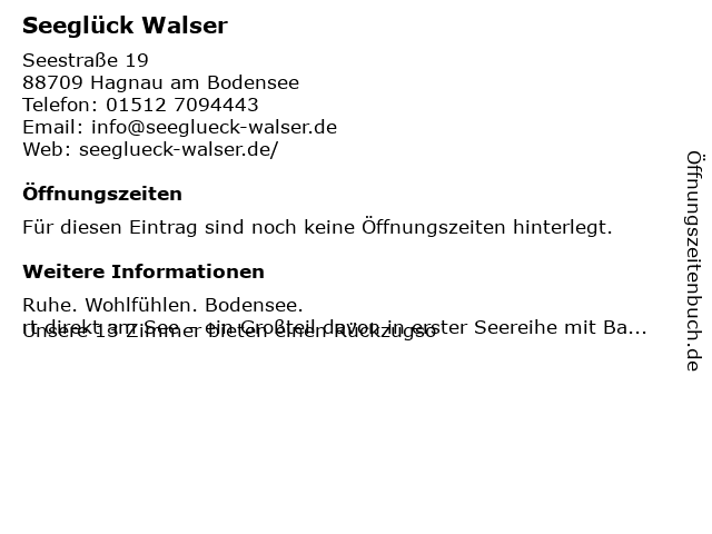 | Öffnungszeiten Seeglück Walser in Hagnau am Bodensee anzeigen | |