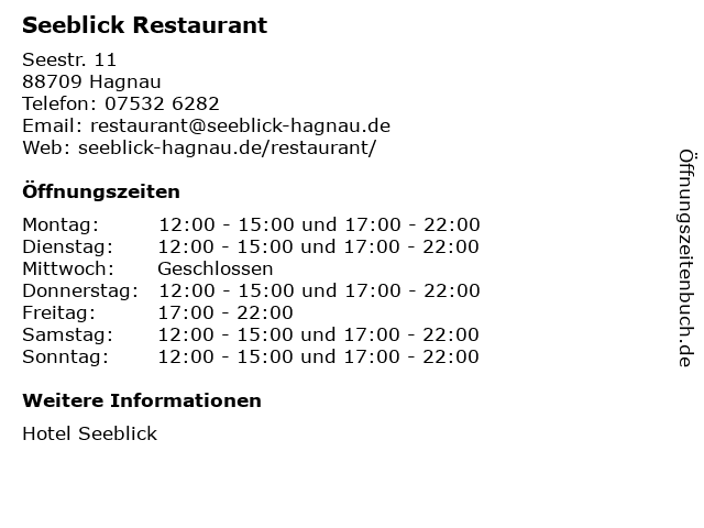 Öffnungszeiten Seeblick Restaurant in Hagnau anzeigen | |