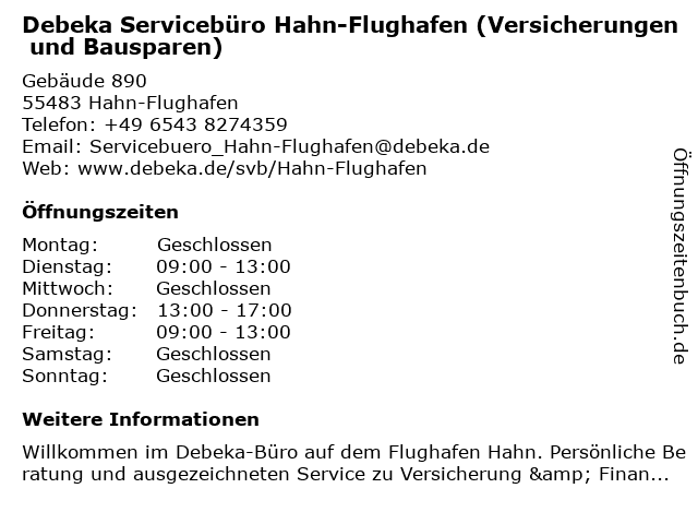 2 Debeka Servicebüro Kirchberg (Versicherungen und Bausparen) (Entfernung: 9,54 km) Hauptstraße 37, 55481 Kirchberg (Hunsrück) 4 Debeka Geschäftsstelle Simmern (Versicherungen und Bausparen) (Entfernung: 18,00 km) Gemündener Straße 10, 55469 Simmern (Hunsrück) 6 |