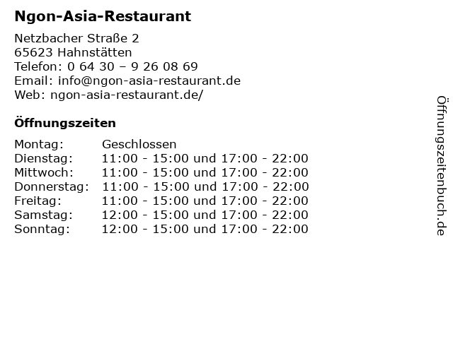 | Öffnungszeiten Ngon-Asia-Restaurant in Hahnstätten anzeigen | |