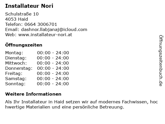 | Öffnungszeiten Installateur Nori in Haid anzeigen | |