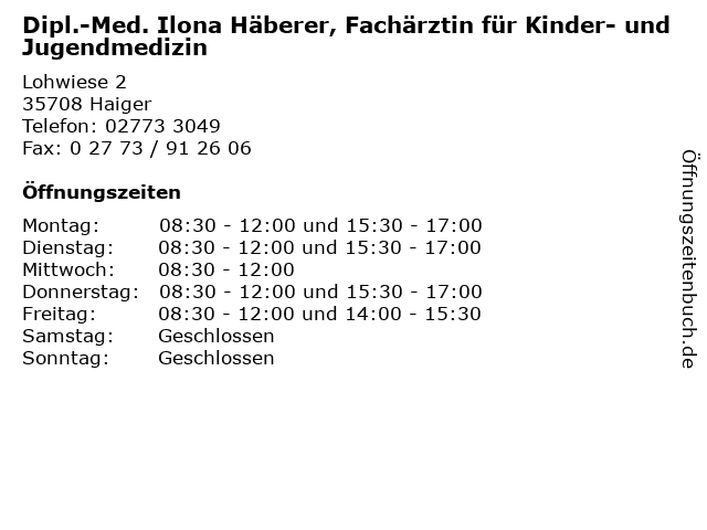 1 Fachärztin für Allgemeinmedizin Jutta Willert-Jacob (Entfernung: 0,38 km) Marktplatz 4-6, 35708 Haiger 2 Andrea Schwalb - Fachärztin für Kinder- und Jugendpsychiatrie (Entfernung: 4,89 km) Hickengrundstr. 75, 57299 Burbach 3 Friederike Heimann Fachärztin für Innere Medizin und Pneumologie (Entfernung: 5,44 km) Von-Arnoldi-Str. 1, 35683 Dillenburg 4 Martina Lommler-Thamer Fachärztin f. Allgemeinmedizin (Entfernung: 8,20 km) Auf den Zäunen 5, 35745 Herborn 6 Dr. med. Sigrid Stämmler-Kunz Fachärztin für Innere Medizin (Entfernung: 9,58 km) Rathausstr. 15, 35713 Eschenburg |