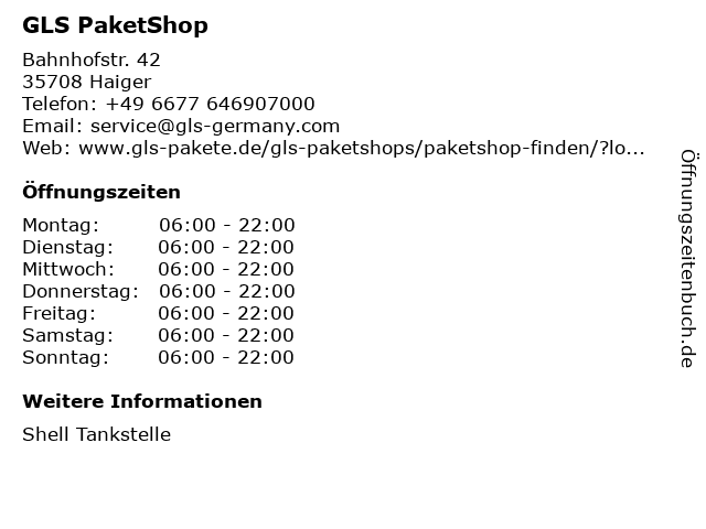| Öffnungszeiten GLS PaketShop in Haiger anzeigen | |