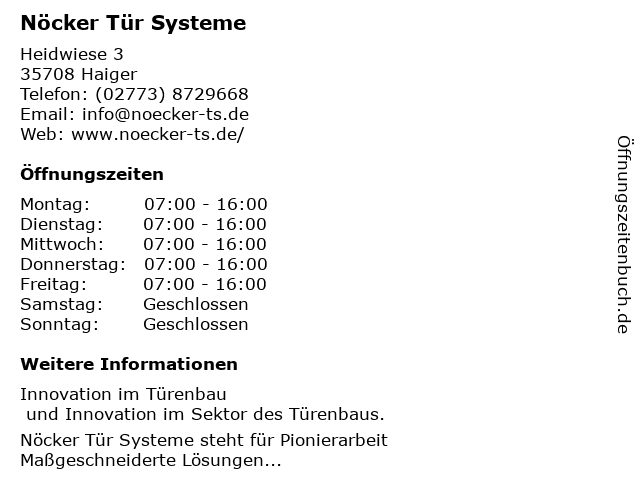 | Öffnungszeiten Nöcker Tür Systeme in Haiger anzeigen | |