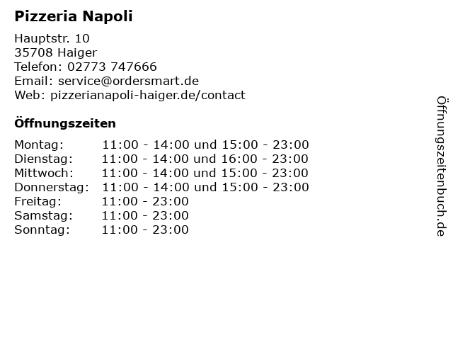 | Öffnungszeiten Pizzeria Napoli in Haiger anzeigen | |
