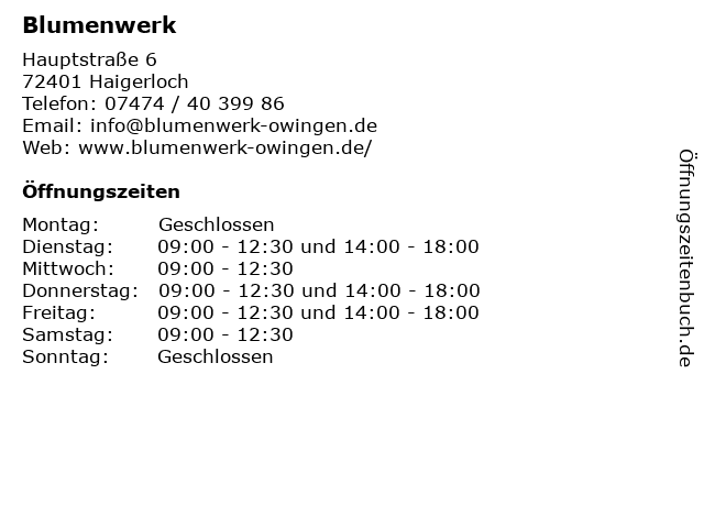 | Öffnungszeiten Blumenwerk in Haigerloch anzeigen | |