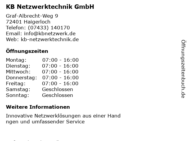 | Öffnungszeiten KB Netzwerktechnik GmbH in Haigerloch anzeigen | |