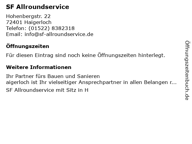 | Öffnungszeiten SF Allroundservice in Haigerloch anzeigen | |