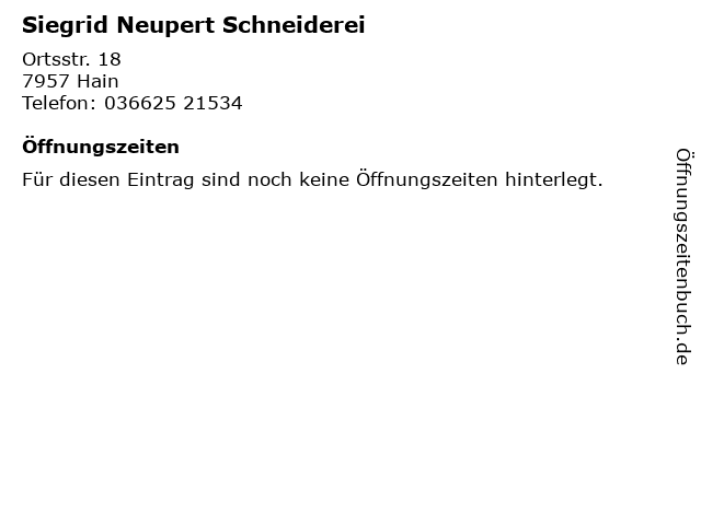 | Öffnungszeiten Siegrid Neupert Schneiderei in Hain anzeigen | |