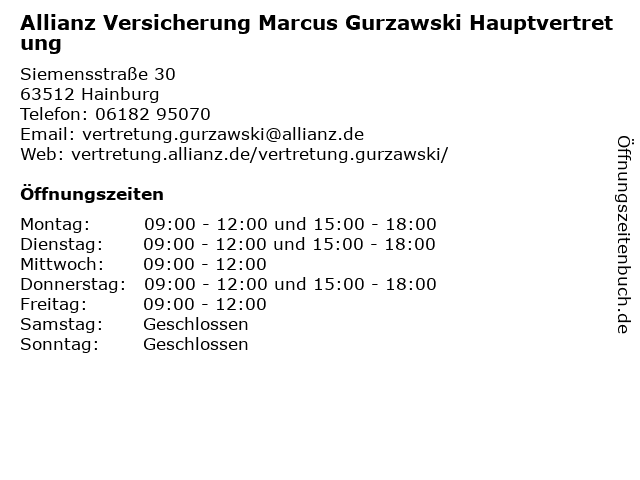 1 Allianz Versicherung Störger und Gurzawski Hauptvertretung (Entfernung: 0,00 km) Siemensstraße 30, 63512 Hainburg 3 Allianz Versicherung Marcel Neppe Hauptvertretung (Entfernung: 2,89 km) Würzburger Straße 8 a, 63500 Seligenstadt 5 6 Marcus Jacob Deutsche Vermögensberatung (Entfernung: 8,64 km) Heusenstammer Str. 33, 63179 Obertshausen |