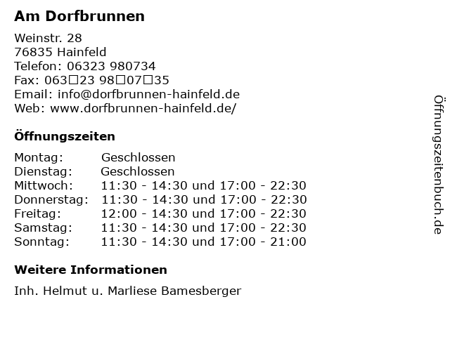| Öffnungszeiten Am Dorfbrunnen in Hainfeld anzeigen | |
