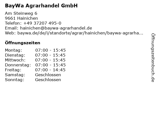 | Öffnungszeiten BayWa Agrarhandel GmbH in Hainichen anzeigen | |