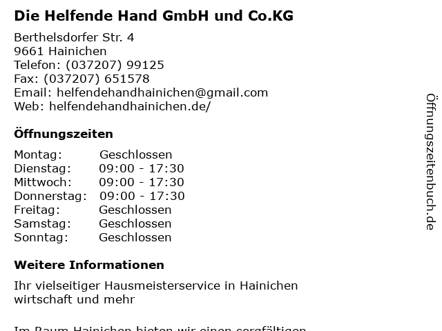 | Branchen & Suchbegriffe zu Die Helfende Hand GmbH und Co.KG:bauservice, beräumungen, beräumungen von grundstücken, co.kg, entrümpelungen, gartenpflege, hand, hausmeister, hauswirtschaft, hecken schneiden, heizkörperreinigung, helfende, rasen mähen, reinigung, wäscheservice |