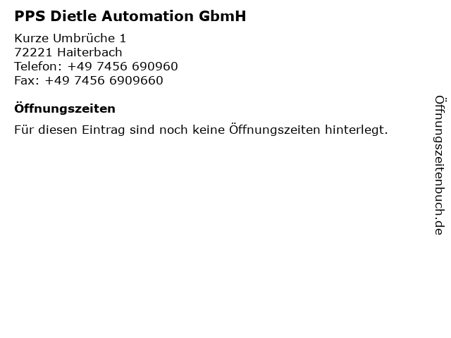 2 PPS Dietle Service u. Produktions GmbH (Entfernung: 10,46 km) Gottlieb-Daimler-Str. 7, 72280 Dornstetten 3 Kallfass GmbH Maschinen plus Automation Maschinenbau (Entfernung: 17,04 km) Röter Str. 44, 72270 Klosterreichenbach 5 HS Automation GmbH Maschinenbau (Entfernung: 18,32 km) Ferdinand-Porsche-Str. 3, 72189 Vöhringen, Württemberg 6 Jürgen Finger Büro für PPS-Realisierung u. Einführung (Entfernung: 39,66 km) Goethestr. 10, 75334 Straubenhardt |