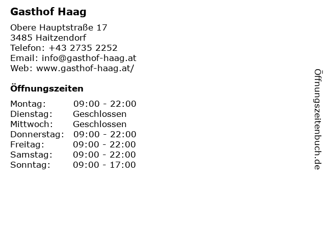 | Öffnungszeiten Gasthof Haag in Haitzendorf anzeigen | |