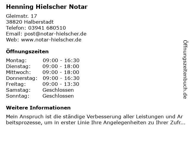 | Öffnungszeiten Henning Hielscher Notar in Halberstadt anzeigen | |