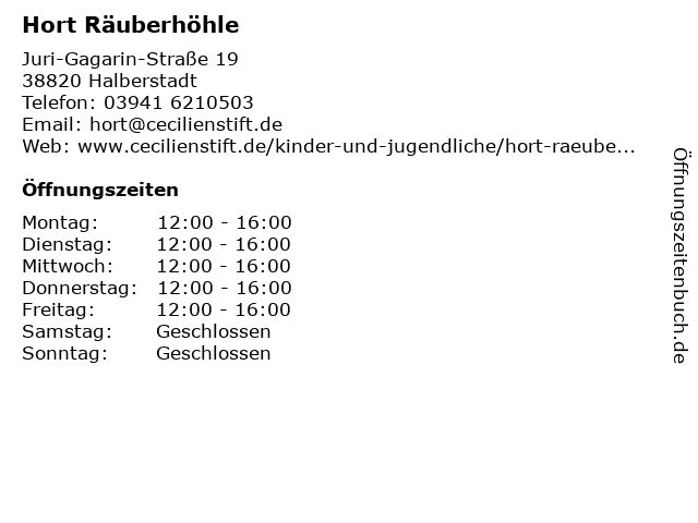 | Öffnungszeiten Hort Räuberhöhle in Halberstadt anzeigen | |