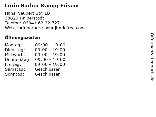 | Öffnungszeiten Lorin Barber & Friseur in Halberstadt anzeigen | |
