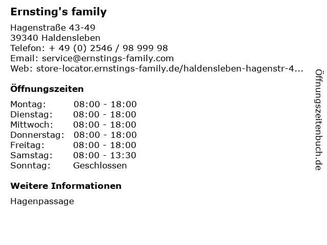| Telefonnummer Ernsting's family in Haldensleben (+ 49 (0) 2546 / 98 999 98) anrufen | |