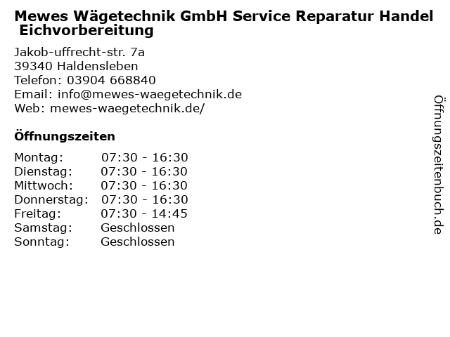 1 Mewes & Götzl Wäge- und Dosiertechnik GmbH (Entfernung: 0,00 km) Jakob-Uffrecht-Str. 7, 39340 Haldensleben 2 Raumausstattung Mewes Gardinen - Polstern (Entfernung: 2,90 km) Satuelle - Haupstraße 35, 39340 Haldensleben 3 Klein Hans-Joachim Handel organischer Rohstoffe (Entfernung: 3,01 km) Bornsche Str. 88, 39340 Haldensleben 6 |