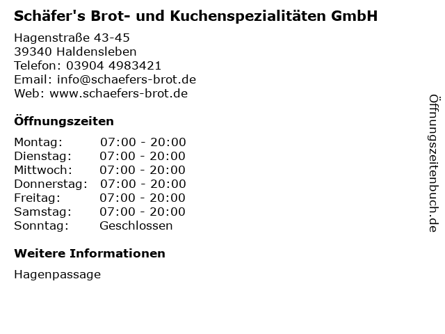 2 Schäfer's Brot- und Kuchenspezialitäten GmbH (Entfernung: 15,91 km) Rogätzer Straße 22, 39326 Wolmirstedt 6 Schäfer’s Brot- und Kuchen-Spezialitäten (Entfernung: 15,79 km) Rogätzer Straße 22, 39326 Wolmirstedt |