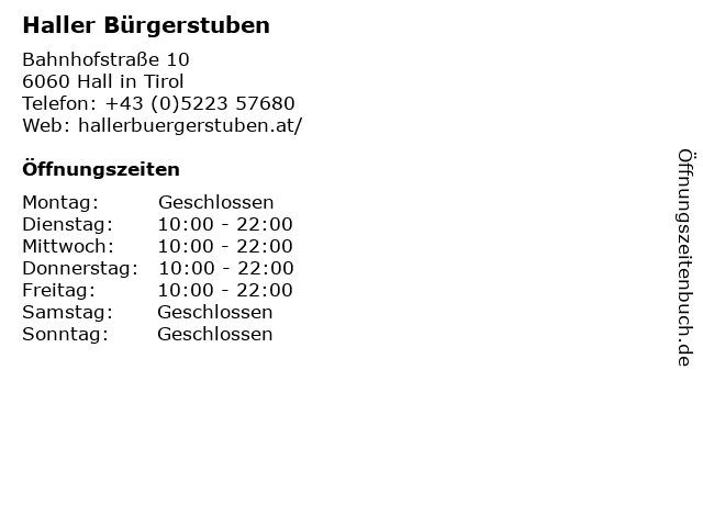| Öffnungszeiten Haller Bürgerstuben in Hall in Tirol anzeigen | |