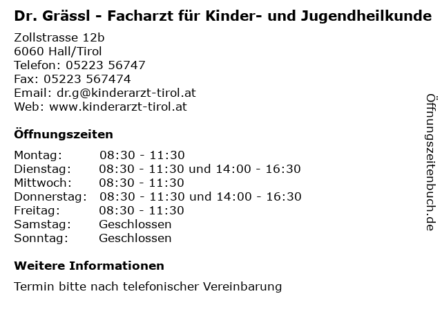 1 Dr. Alcivar-Eisterer Maria-Eugenia Kinder- und Jugendheilkunde (Entfernung: 5,65 km) An-der-Lan-Straße 39, 6020 Innsbruck 2 Dr. Kerstin Luze-Prager - FÄ f. Kinder- und Jugendheilkunde (Entfernung: 6,41 km) Grabenweg 58, 6020 Innsbruck 3 Dr. H. Christina Pichler-Gerges - Fachärztin für Kinder- und Jugendheilkunde (Entfernung: 8,95 km) Rettenbergstrasse 12, 6114 Kolsass 5 Allergieambulatorium Univ-Doz Dr Heinz Kofler (Entfernung: 0,60 km) Thurnfeldgasse 3a, 6060 Hall I. Tirol 6 Dr. Roland Fuschelberger - Facharzt für Innere Medizin (Entfernung: 1,68 km) Getznerstraße 2, 6060 Hall |