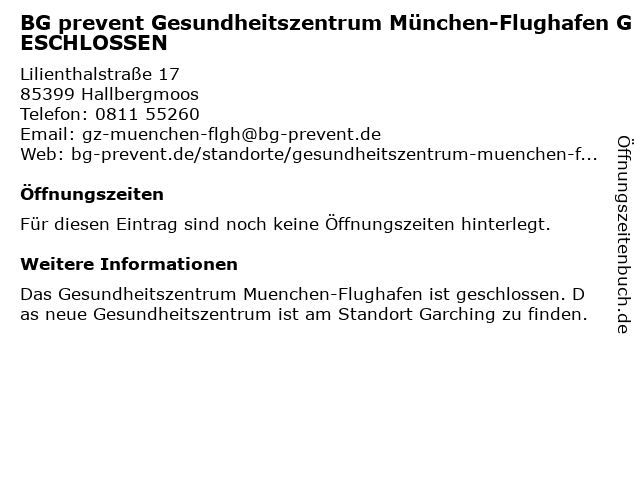| BG prevent Gesundheitszentrum München-Flughafen GESCHLOSSEN anrufen | |