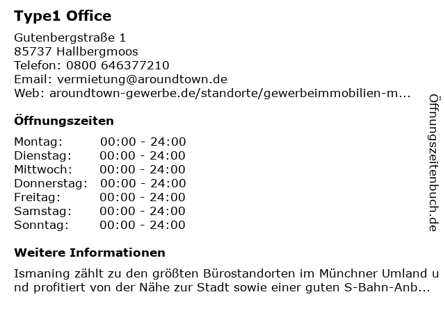 | Öffnungszeiten Type1 Office in Hallbergmoos anzeigen | |