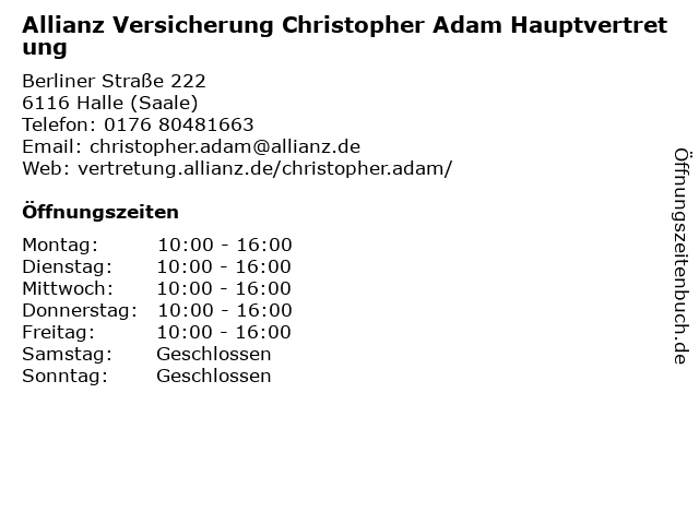 1 Allianz Versicherung Annette Jarski Hauptvertretung (Entfernung: 1,19 km) Grenzstraße 26 b, 06112 Halle (Saale) 3 Allianz Hauptvertretung Hans-Joachim Lau (Entfernung: 1,31 km) Paracelsusstraße 6B, 06114 Halle (Saale) 4 Allianz Versicherung Michael Lages Hauptvertretung (Entfernung: 1,35 km) Friesenstraße 26, 06112 Halle (Saale) 6 Allianz Versicherung Steven Heinicke Hauptvertretung (Entfernung: 2,70 km) Robert-Franz-Ring 2, 06108 Halle (Saale) |