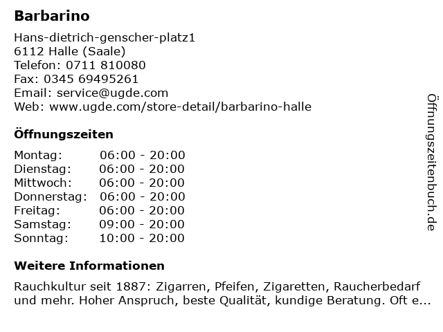 | Öffnungszeiten Barbarino in Halle (Saale) anzeigen | |