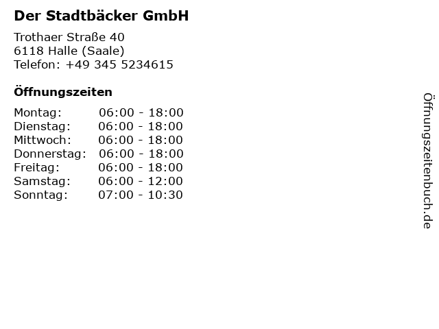 | Öffnungszeiten Der Stadtbäcker GmbH in Halle (Saale) anzeigen | |