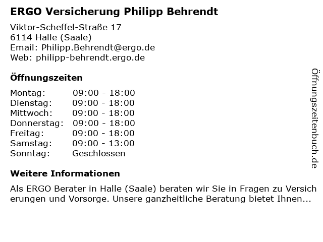 | Öffnungszeiten ERGO Versicherung Philipp Behrendt in Halle (Saale) anzeigen | |