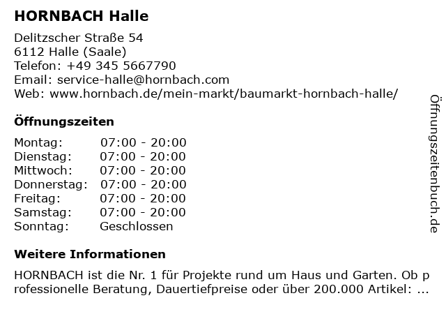 Öffnungszeiten HORNBACH Halle in Halle (Saale) anzeigen | |
