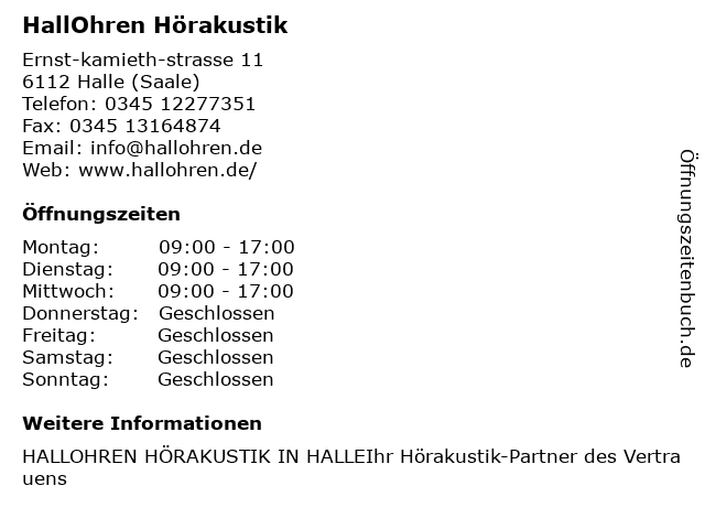 Öffnungszeiten HallOhren Hörakustik in Halle (Saale) anzeigen | |