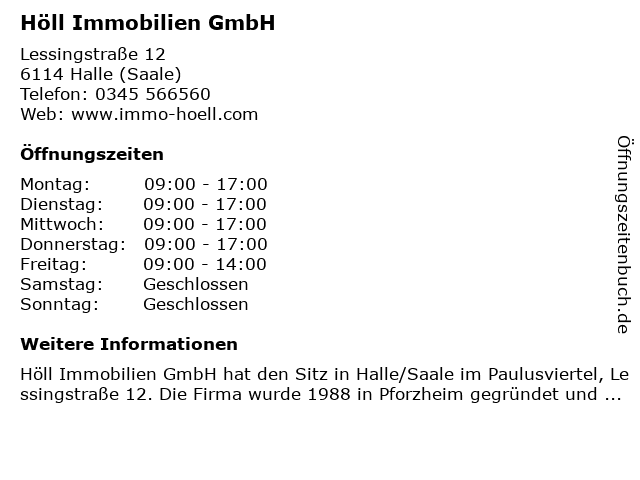 | Öffnungszeiten Höll Immobilien GmbH in Halle (Saale) anzeigen | |