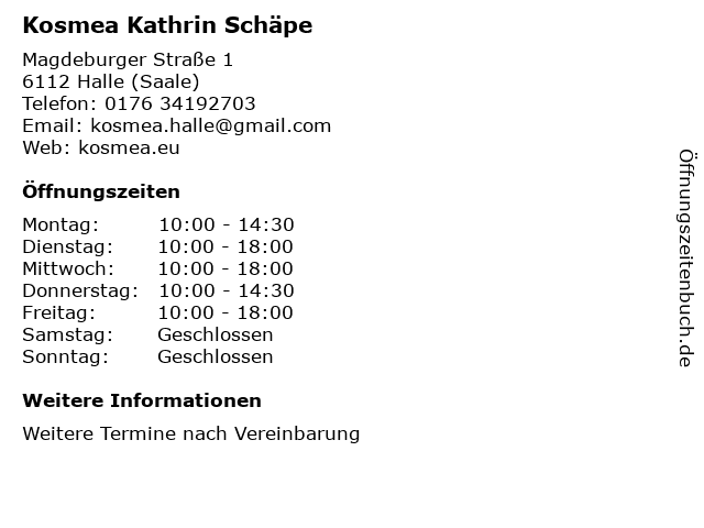 | Öffnungszeiten Kosmea Kathrin Schäpe in Halle (Saale) anzeigen | |