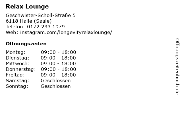 | Öffnungszeiten Relax Lounge in Halle (Saale) anzeigen | |