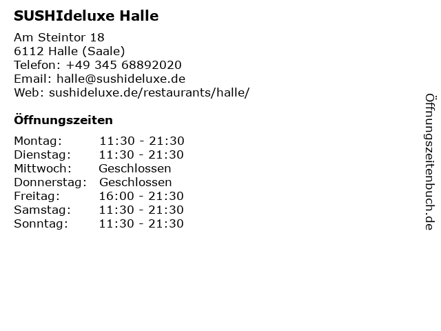 | Öffnungszeiten SUSHIdeluxe Halle in Halle (Saale) anzeigen | |