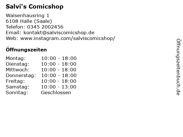 | Öffnungszeiten Salvi's Comicshop in Halle (Saale) anzeigen | |