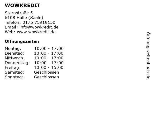 | Öffnungszeiten WOWKREDIT in Halle (Saale) anzeigen | |