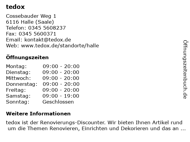 | Öffnungszeiten tedox in Halle (Saale) anzeigen | |