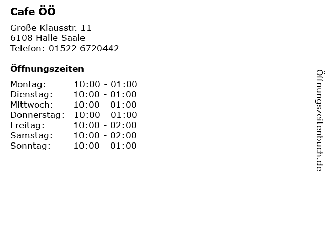| Öffnungszeiten Cafe ÖÖ in Halle Saale anzeigen | |