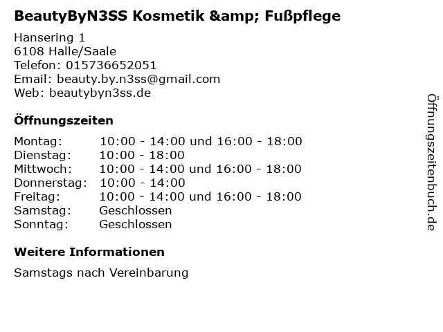 Branchen & Suchbegriffe zu BeautyByN3SS Kosmetik & Fußpflege:beautybyn3ss, fußpflege, hautpflege, kosmetik, podologie, schönheit, schönheitssalon |