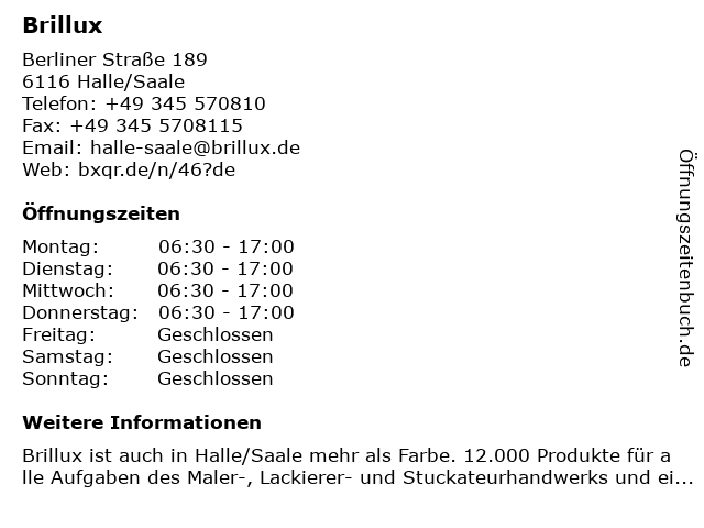 | Öffnungszeiten Brillux in Halle/Saale anzeigen | |