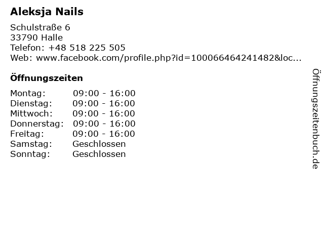 | Öffnungszeiten Aleksja Nails in Halle anzeigen | |