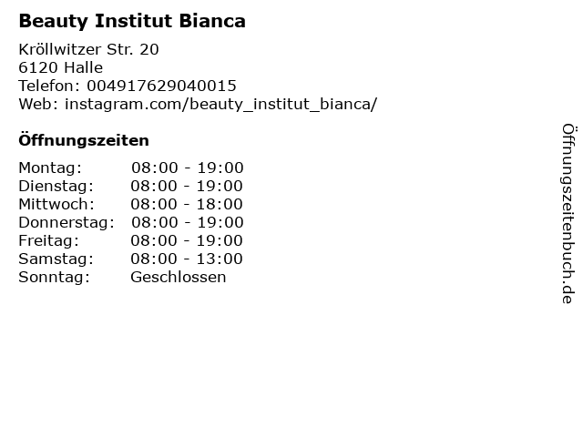 | Öffnungszeiten Beauty Institut Bianca in Halle anzeigen | |