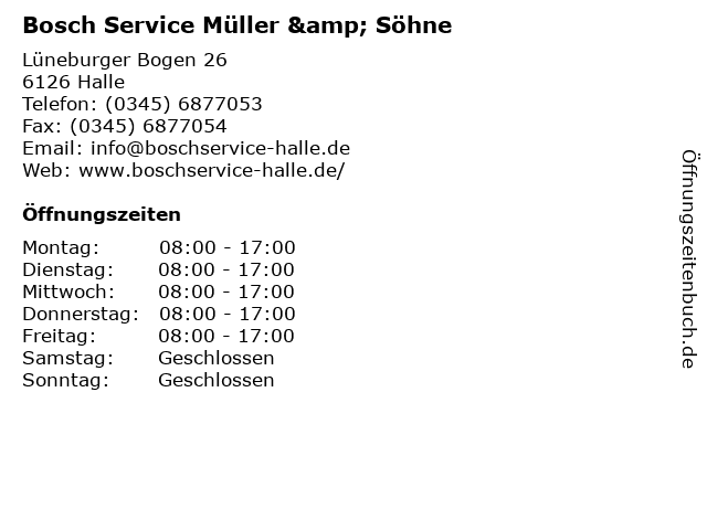 | Öffnungszeiten Bosch Service Müller & Söhne in Halle anzeigen | |
