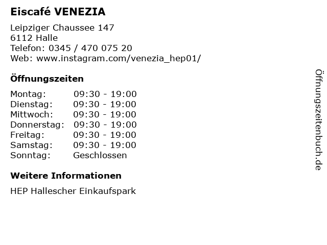| Öffnungszeiten Eiscafé VENEZIA in Halle anzeigen | |