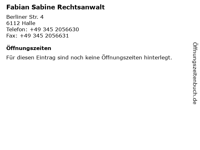 | Öffnungszeiten Fabian Sabine Rechtsanwalt in Halle anzeigen | |